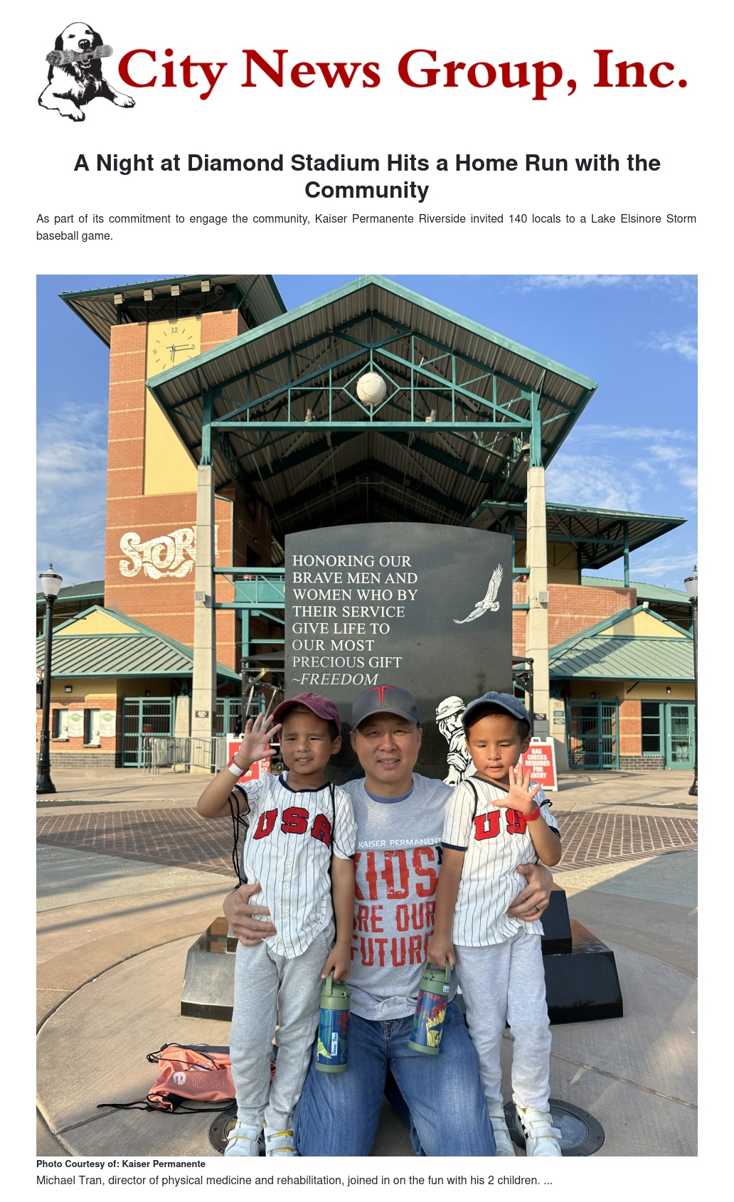 It was a night of community spirit at Diamond Stadium. Members of the Boys & Girls Club of Inland Valley and their families were treated to a pre-game extravaganza, complete with free snacks, giveaways, and fun activities. Kaiser Permanente leadership, physicians, and Riverside service area staff were there, interacting with the community and handing out t-shirts. Together, everyone cheered on the Lake Elsinore Storm to an exciting win, creating lasting moments of community engagement.