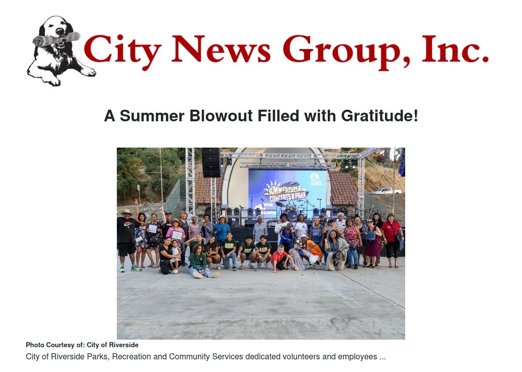 Our final concert of our Summer Concerts in the Park was a memorable evening filled with gratitude and celebration. We extended heartfelt thanks to our dedicated volunteers for their incredible efforts over the past year. The night was made even more special by a fantastic performance from 24K Magic, who had the crowd dancing and singing along. We would love for you to get involved! We are constantly in need for more volunteers to join our community efforts, with opportunities available to coach Youth Sports, Adopt-A-Park, or Mentor in any of our community centers. We welcome volunteers of all ages, including teenagers and older, to make a positive impact in our community. Email Parks@riversideca.gov or visit your local community center to learn more.