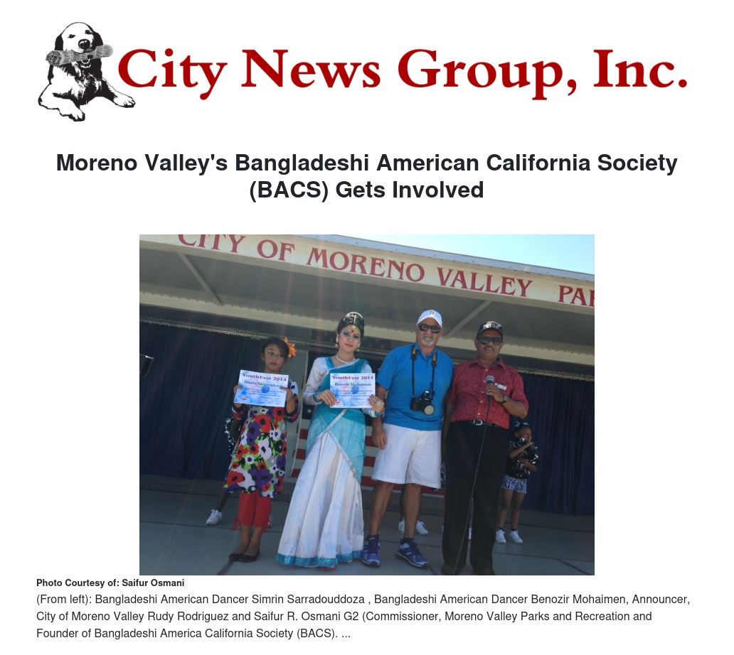 Moreno Valley Parks and Recreation Commissioner Saifur Osmani started a non-profit organization called Bangladeshi American California Society (BACS) in 2012 that has had multiple community-oriented events and achievements since. The goal of their organization is to build a bridge for a multicultural community, for other cultures to learn about the Bangladesh culture, and for them to learn about other cultures and to share their views and perspectives.