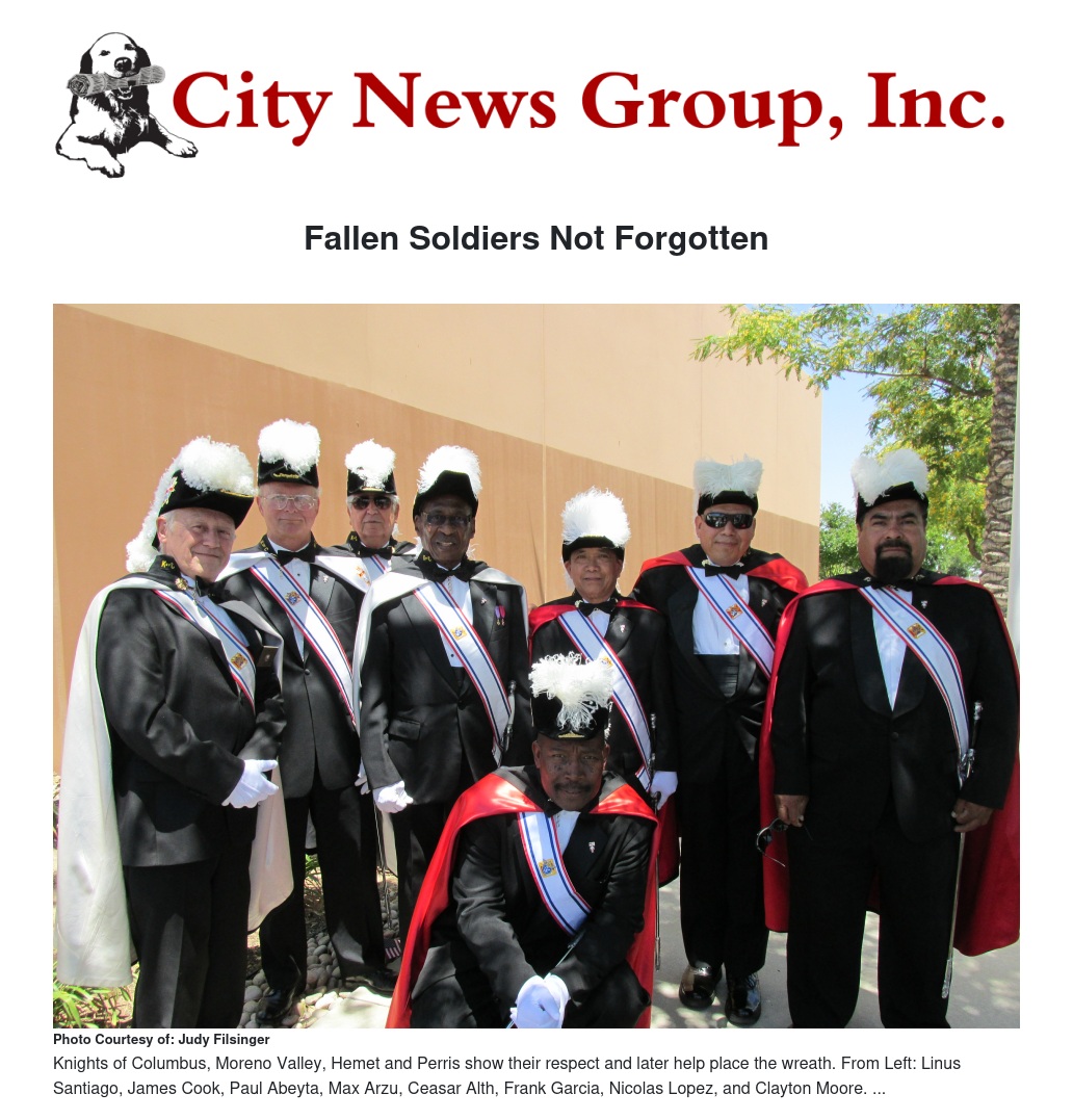 A duty now falls to all those present and hearing Moreno Valley's eleven names, to guard the memory of those soldiers with the same "sacred vigilance" Gen. Logan once commanded of his soldier's memories. In closing, Mayor Tom Owings, Moreno Valley council members, members of the Knights of Columbus of Moreno Valley, Hemet and Perris, and the A.F. Chelbana Assembly placed a wreath at the foot of a bronze statue solemnly named, "Fallen Soldier," created by artist Richard Rist and dedicated by Moreno Valley on June 14th, 2007. A reception followed graced by the artwork of Moreno Valley students.