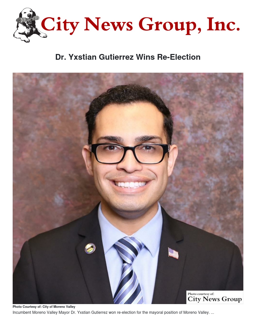 MORENO VALLEY>> The results of local elections are in as Incumbent Moreno Valley Mayor Dr. Yxstian Gutierrez won re-election against seven other Moreno Valley candidates.