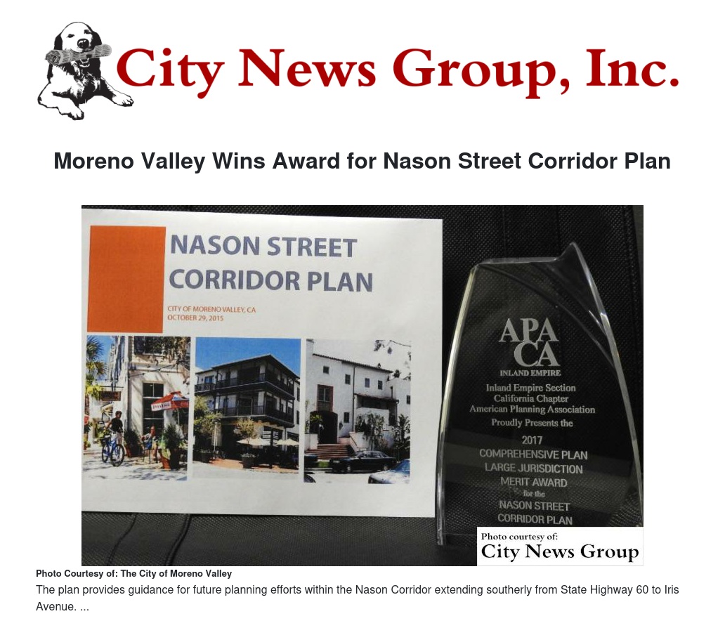 The City of Moreno Valley was presented with a Merit Award for the Nason Street Corridor Plan at the 2017 American Planning Association – Inland Empire Section awards on May 18 at the Riverside Convention Center.