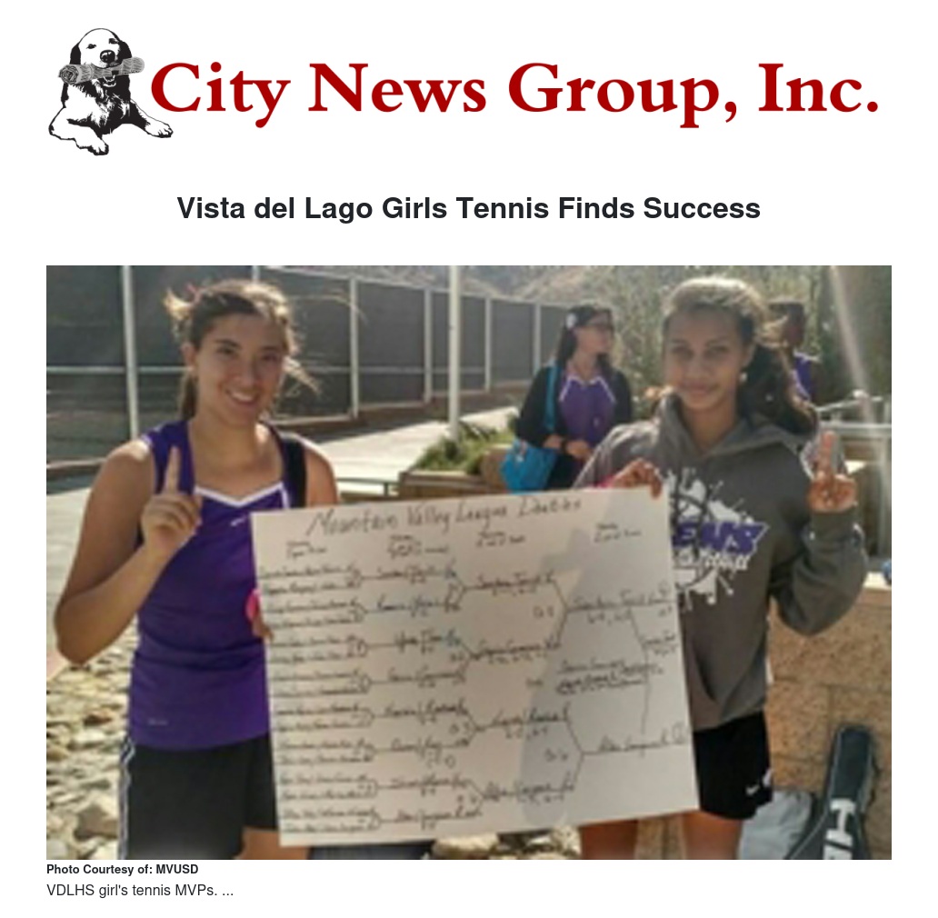 The sports renaissance that’s been taking place this year at Vista del Lago High School can almost be traced back to last year’s girls tennis team’s strong finish. The girls continued their winning ways this year. Recently, the Ravens competed at the two-day Mountain Valley League Tennis Championship, an end-of-year tournament to determine who the best individual singles players and doubles team are in the league. After first being announced as League Doubles MVPs, Danielle Sanchez and Kailee Terrill won the tournament, defeating Rubidoux in the final round with a commanding 6-1, 6-0 score.