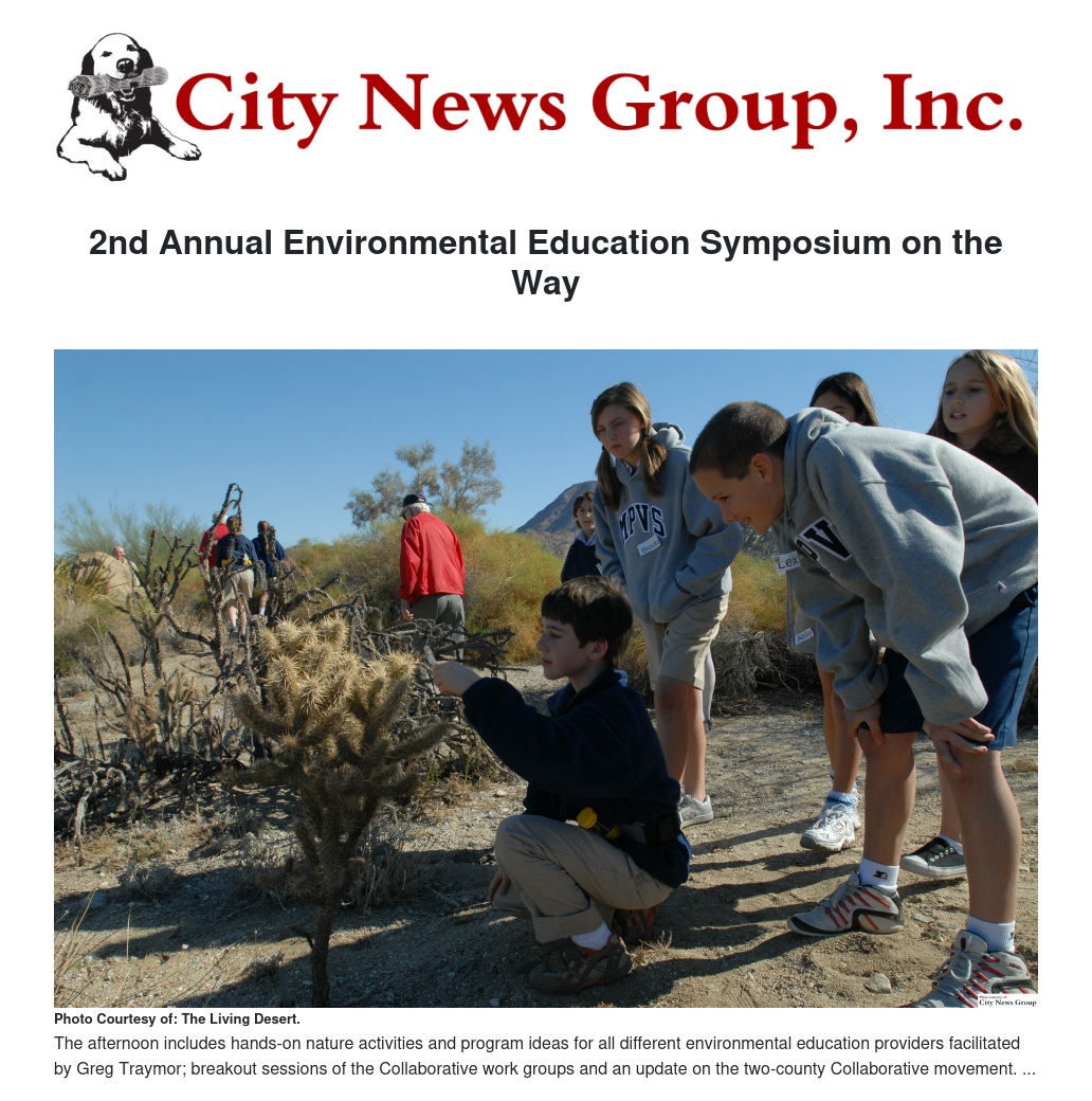 The Environmental Education Collaborative, serving Riverside and San Bernardino counties, is a grassroots effort three-years in the planning for the purpose of developing funding, program, and advocacy resources to support environmental education programs in Riverside and San Bernardino counties.