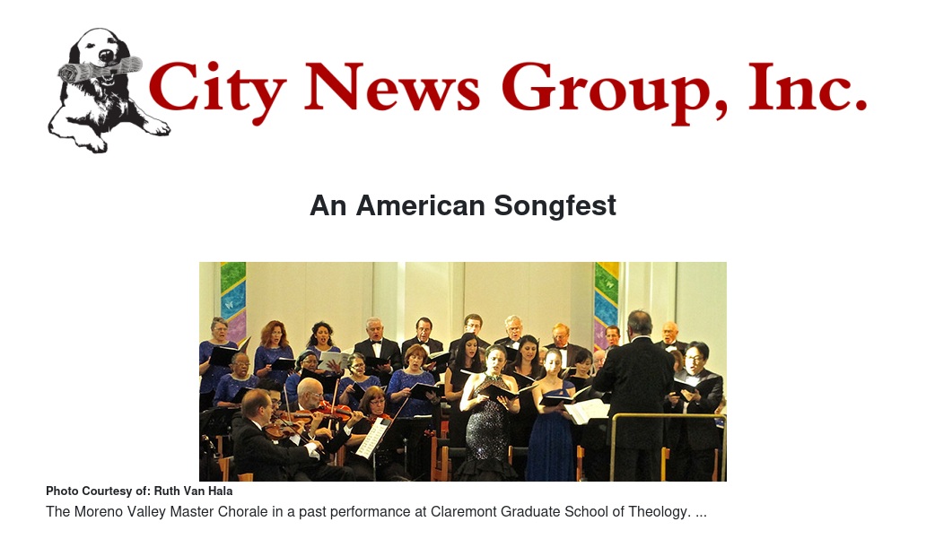 On Sunday, June 9th, 2019 at 4:00 P.M., the Moreno Valley Master Chorale and Orchestra will present: “An American Songfest.” The concert will be held at the Shepherd of the Valley Lutheran Church, 11650 Perris Blvd. in Moreno Valley. This “Pops” concert will be our last concert of the season, and will feature favorite songs by American composers. Several of our Chorale soloists will be performing and, of course, “The Bach Street Boys” will again be entertaining the audience with one of their hilarious musical spoofs.