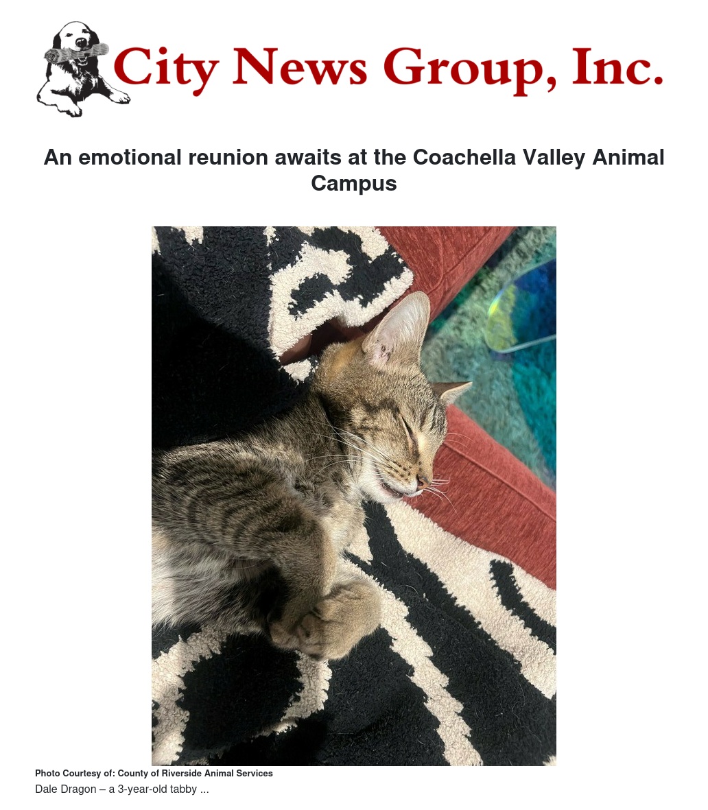 If not for a kind couple from Rancho Mirage who found Dale Dragon, the reunion may not have happened. The couple – and their three dogs – have been caring for the stray feline since late May. Also, Dale Dragon is embedded with a microchip, a valuable tool to assist with reunions.