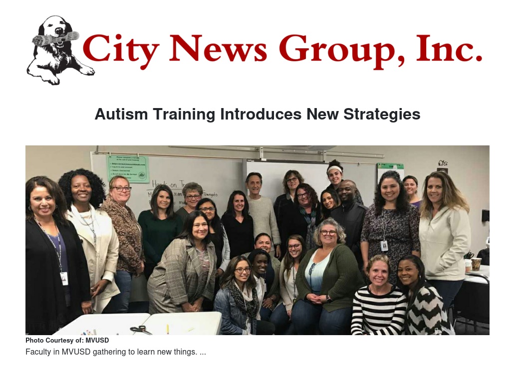The training took place at the Professional Development Center, and was followed up with four days of hand on training with students with autism. Under the direction of Pamela Bender, Executive Director of SELPA, Program Specialist Julie Williams was able to coordinate the training to include as many participants as possible.