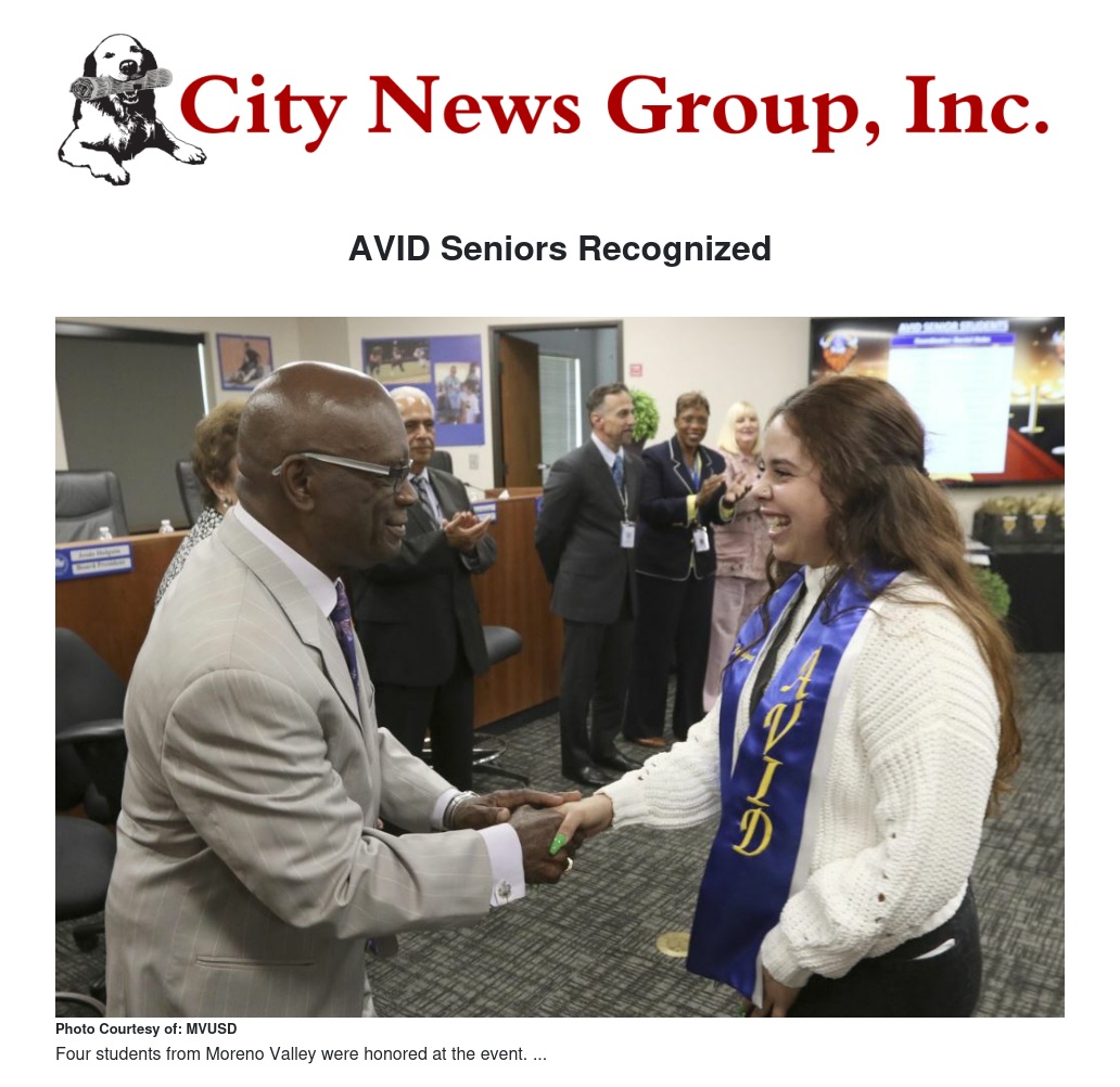 Many of the same AVID seniors were individually recognized by the MVUSD Board of Education held at the district office boardroom. Between the UCR event and MVUSD event, about 400 students were recognized. All of the district’s AVID seniors have enrolled in college for the fall and will be pursuing their dream careers.