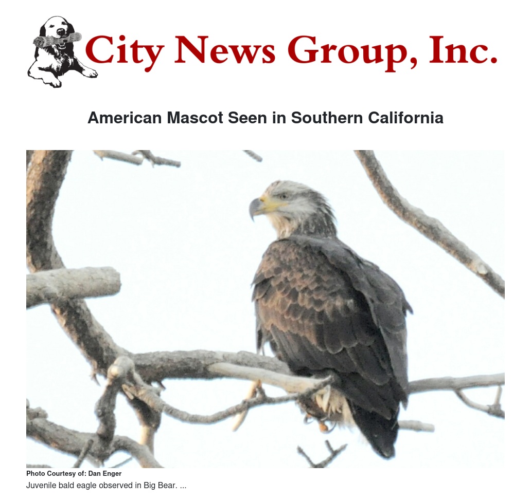· Big Bear Lake area volunteers will meet at 8 a.m. at the Forest Service’s Big Bear Discovery Center on North Shore Drive for orientation. Contact Rari Marks (rariemarks@fs.fed.us or 909-382-2600, extension 4075) for more information. Please call 909-382-2832 for cancellation due to winter weather conditions – an outgoing message will be left by 6:30 a.m. on the morning of the count if it has to be cancelled. Contact the Discovery Center (909-382-2790) for information about Eagle Celebrations. There will also be a free slideshow about bald eagles at 11 a.m. after the counts and on Dec. 27 and Jan. 17.