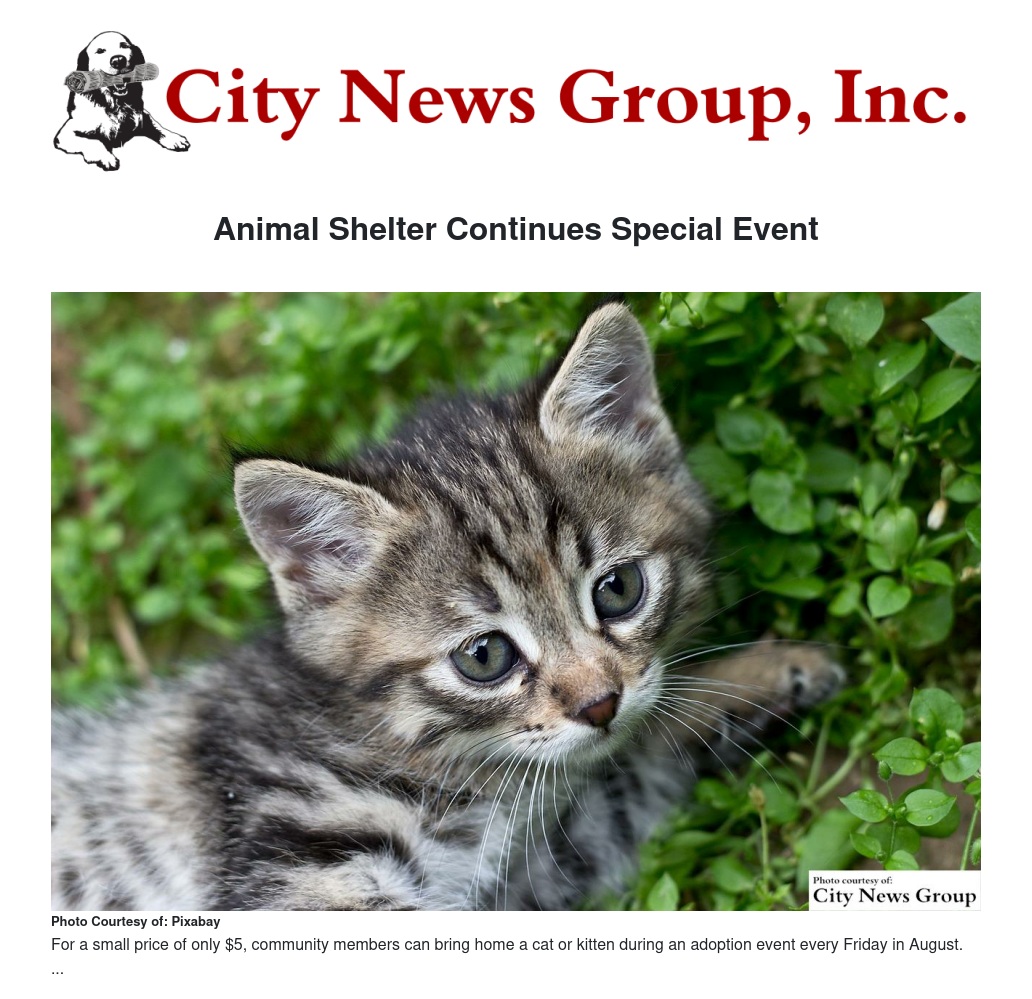 On Aug. 12, Aug. 19 and Aug. 26, citizens are invited to adopt a cat or kitten at the shelter.