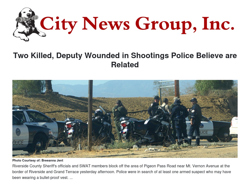 Riverside County police and SWAT team members were gathered yesterday afternoon at Pigeon Pass Road near Sandals Church, on the border between Riverside and Grand Terrace.