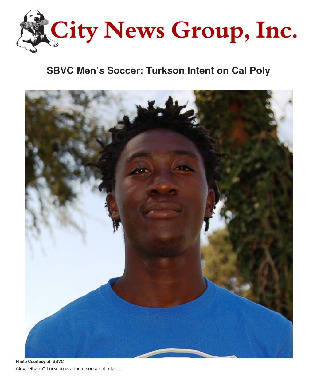 San Bernardino Valley College (SBVC) Men’s Soccer forward Alex “Ghana” Turkson (Valley View High School, Moreno Valley) has signed a letter of intent with Cal Poly Pomona.