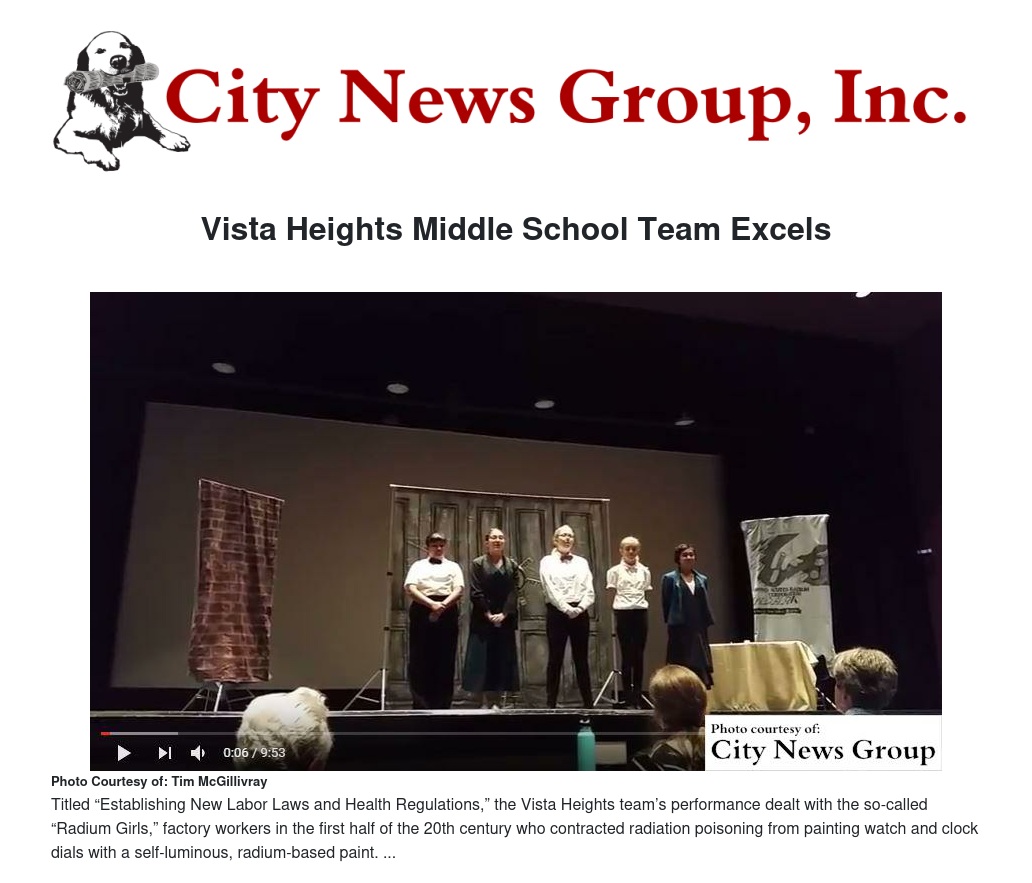 The theme of the 2016-17 National History Day was “Taking a Stand in History.” Titled “Establishing New Labor Laws and Health Regulations,” the Vista Heights team’s performance dealt with the so-called “Radium Girls,” factory workers in the first half of the 20th century who contracted radiation poisoning from painting watch and clock dials with a self-luminous, radium-based paint.