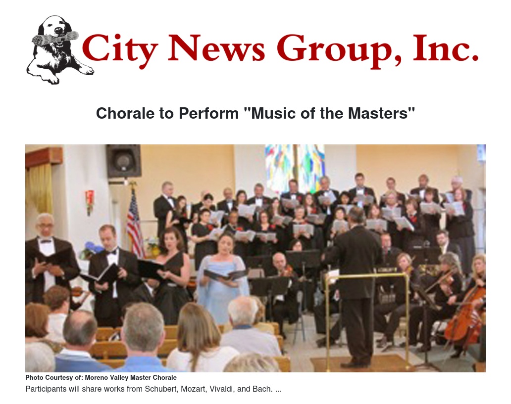 On Sunday, April 6th at 4 p.m., the Moreno Valley Master Chorale and Orchestra will present a concert featuring the works of Schubert, Mozart, Vivaldi, and Bach. Dr. Viorel Gheorgh will be directing Bach's Concerto for Violin and Orchestra in A Minor with renowned soloist Zlata Grekov on violin. This will be followed by Vivaldi's In Furore Justissimae Irae, featuring Soprano Soloist Camelia Vion.