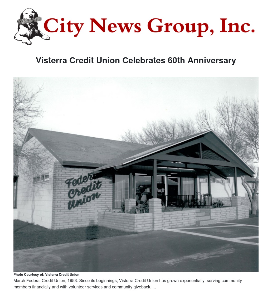 Visterra Credit Union, a full-service financial institution locally headquartered in Moreno Valley, is celebrating its 60th anniversary this month.