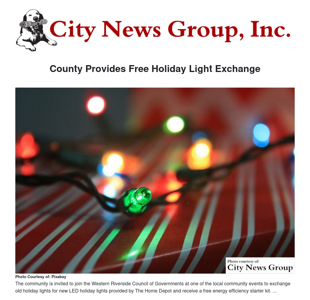 The community is invited to join the Western Riverside Council of Governments at one of the local community events to exchange old holiday lights for new LED holiday lights provided by The Home Depot and receive a free energy efficiency starter kit.