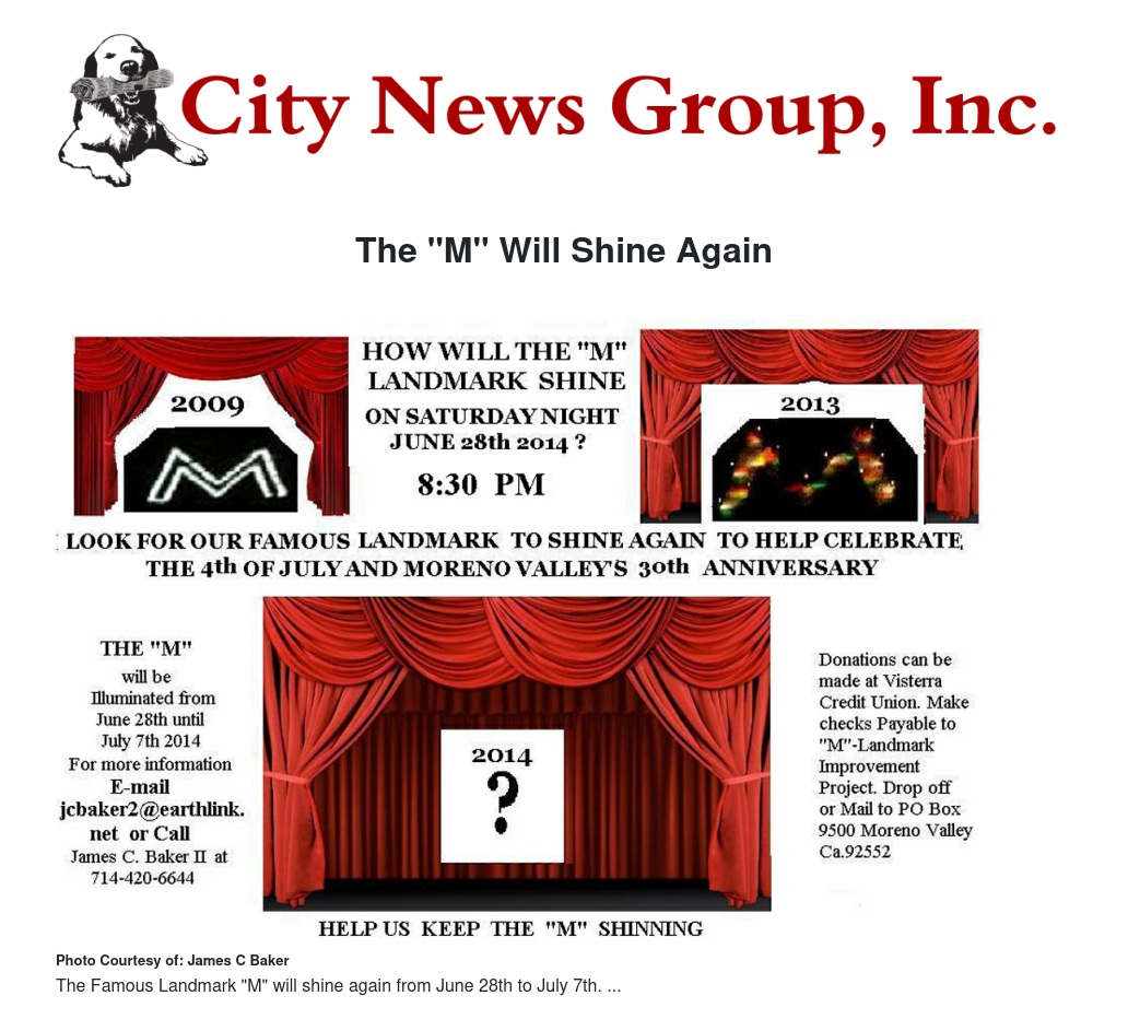 "The Famous Landmark "M" which rests on the side of Box Springs Mountain will shine again starting June 28th 2014, until July 7th 2014," says James C. Baker II, who serves as the City's Park & Recreation Commission Chairman.