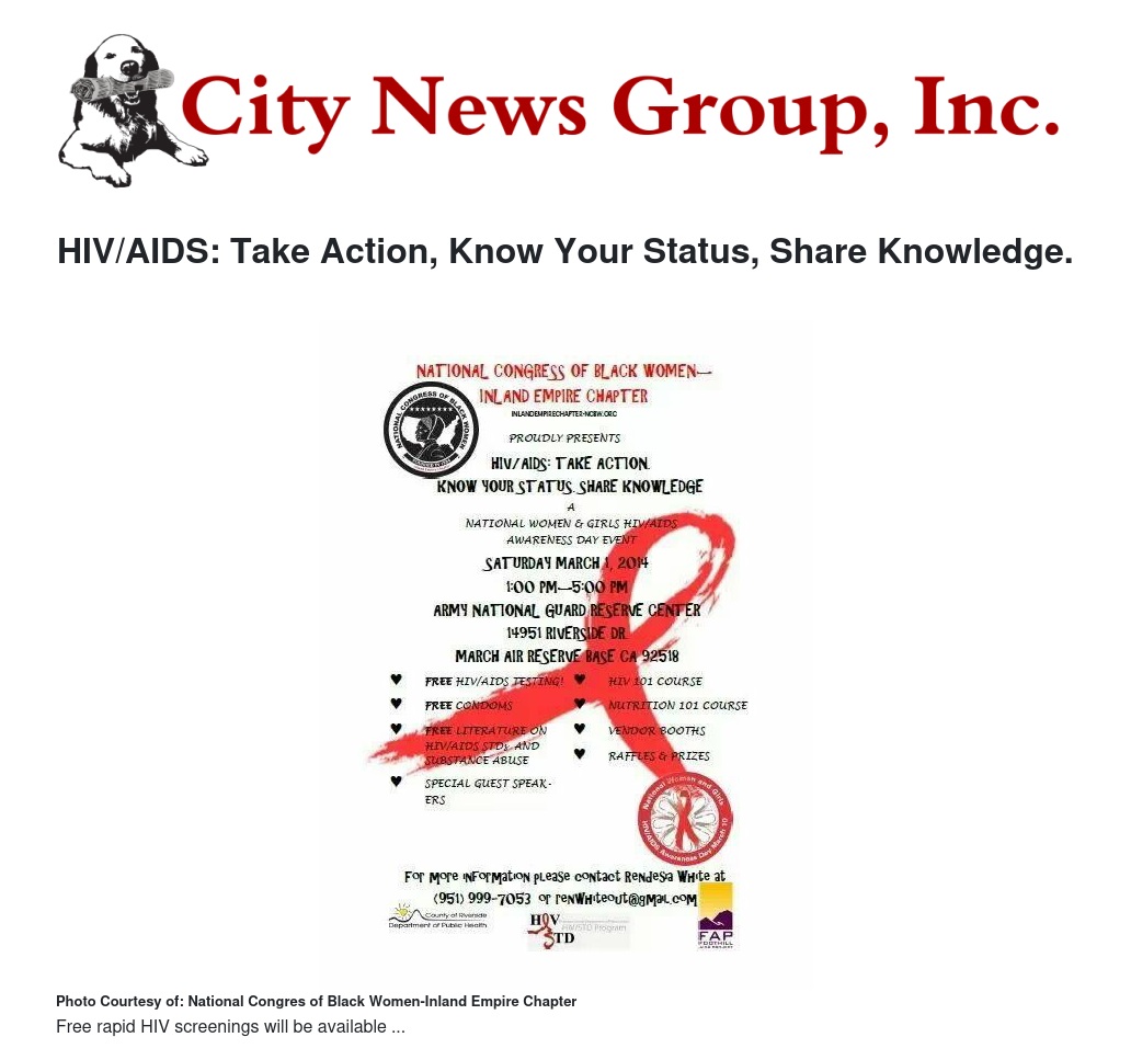 This year, NGBW-IEC is hosting an HIV/AIDS Awareness event March 1 in Moreno Valley. The event is entitled "HIV/AIDS: Take Action. Know Your Status. Share Knowledge". The event will feature a free rapid HIV testing, a crash course in HIV, and guest speakers to name a few. There will also be a raffle and giveaways. Women and girls of all ages are encouraged to attend. For more information on the event, visit www.citynewsgroup.com.