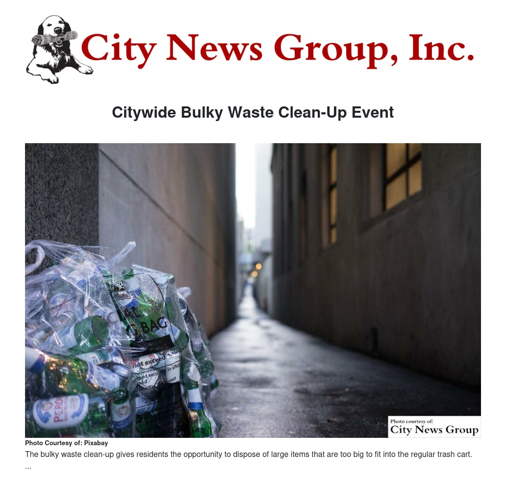 The bulky waste clean-up gives residents the opportunity to dispose of large items that are too big to fit into the regular trash cart. These items may include furniture, mattresses, old appliances, electronic waste or excess trash. Household hazardous waste such as latex or oil based paint, empty drums, motor oil, batteries or tires will not be accepted at the event. Residents will be required to show either a photo ID, utility bill or event postcard as proof of residency and should be prepared to unload waste materials themselves.