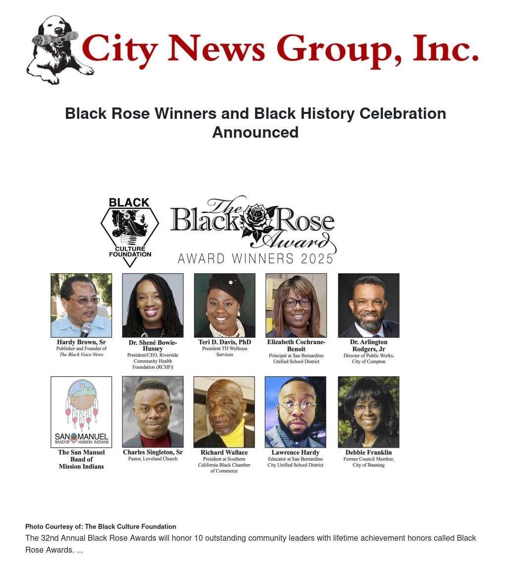 The Black Culture Foundation announces the Annual San Bernardino Black History Celebration, featuring the 46th Black History Parade, Festival's 32nd annual Black Rose Awards. Both events are on Saturday, February 1, and Gospel Fest on Saturday, February 22, 2025.