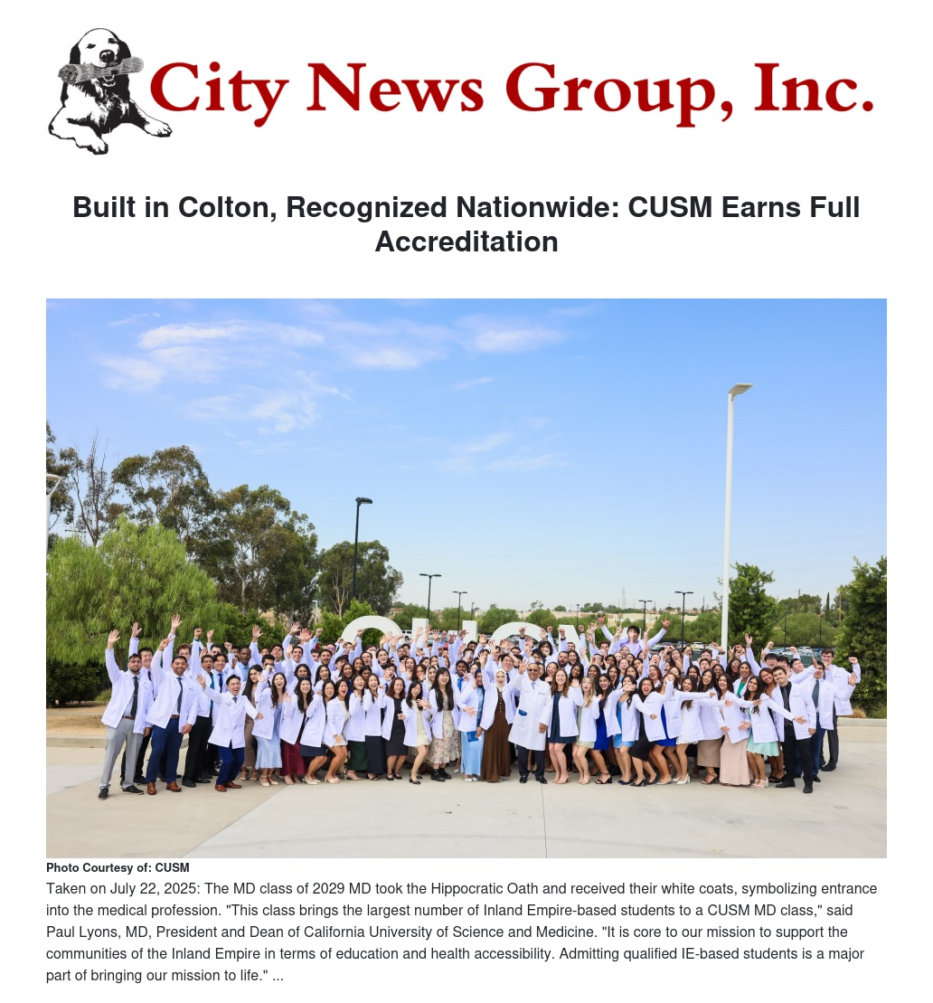 Built in Colton, Recognized Nationwide: CUSM Earns Full Accreditation by Cynthia Baker - City News Group, Inc.