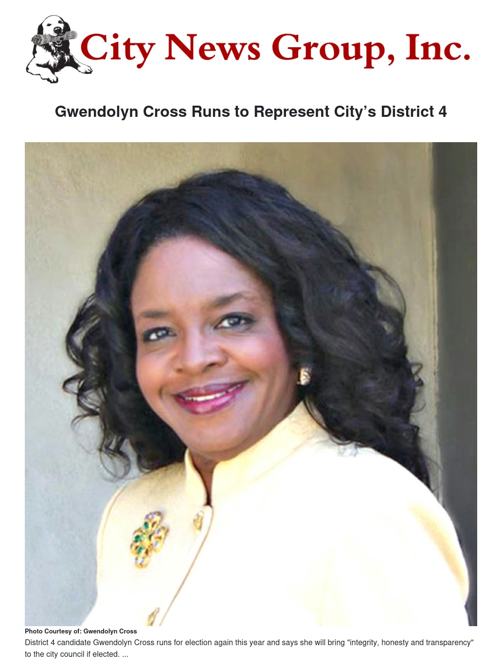 Gwendolyn Cross, a business owner who describes herself as a community activist, is running to represent Moreno Valley’s District 4 on the November 2014 ballot, four years after losing by 49 votes to former councilmember Marcelo Co in 2010.