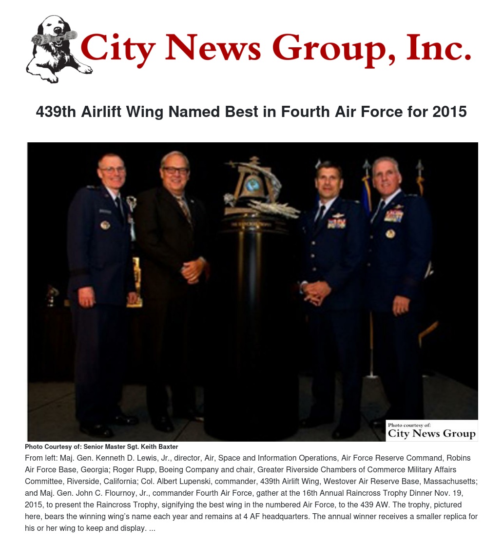 The 439th Airlift Wing, Westover Air Reserve Base, Massachusetts, was awarded the 2015 Raincross Trophy at a dinner Thursday, Nov. 19, naming them best wing in Fourth Air Force, a title they will carry for the next year.