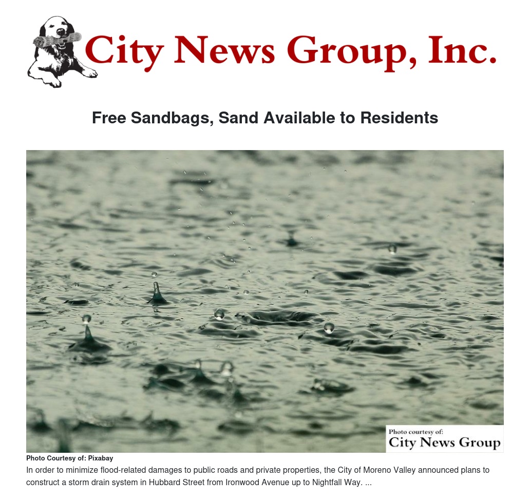 Empty sandbags and loose sand will be available at the City Yard Main Office, 25180 Santiago Drive in Moreno Valley, Monday through Friday, 7 a.m. - 4 p.m., the Sunnymead Ranch Fire Station No. 48 located at the southwest corner of Sunnymead Ranch Parkway and Village Road in Moreno Valley, 8 a.m. to 8 p.m., and the Sunnymead Ranch Fire Station No. 2 located at Hemlock Avenue west of Perris Boulevard, 8 a.m. to 8 p.m.