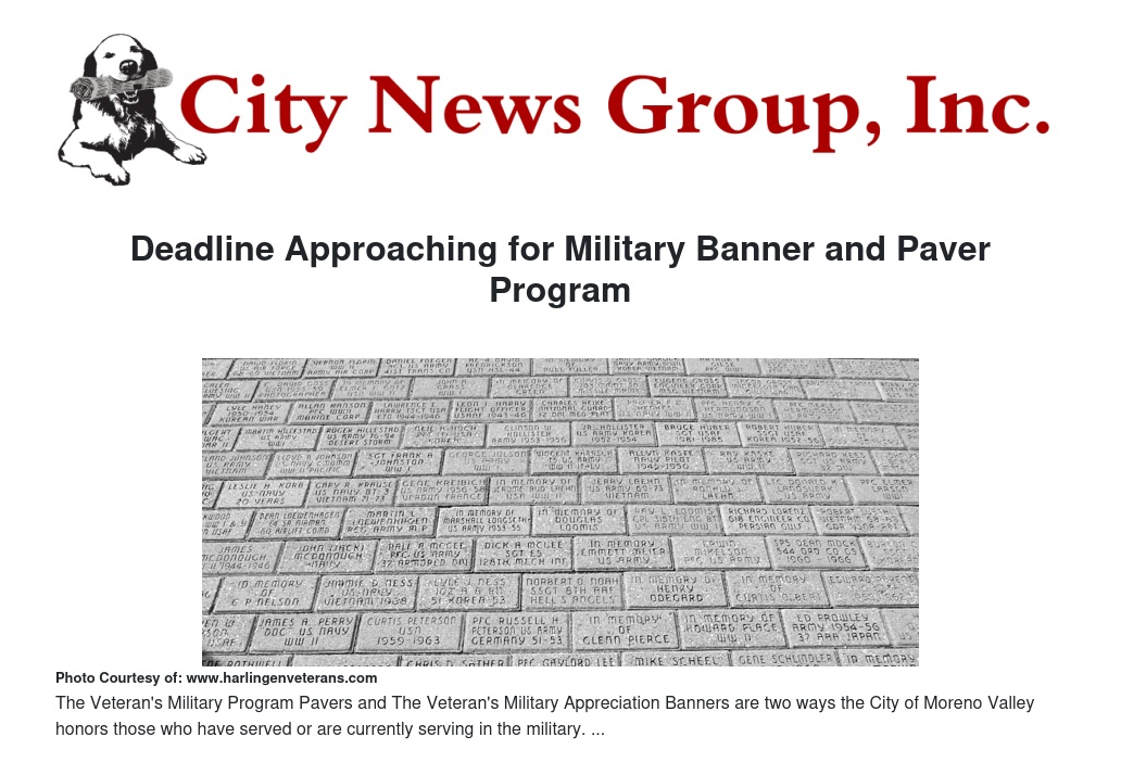 To qualify for a banner, honorees must be active-duty military service personnel who are residents of Moreno Valley, who have immediate family residing in Moreno Valley, or who have graduated from a Moreno Valley High School. To qualify for a paver, honorees must be currently serving or have served in the US military or with a US ally.