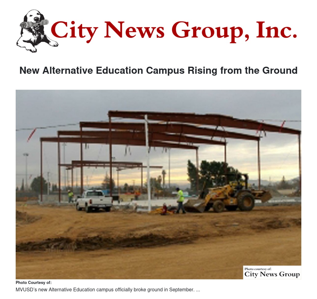 At its September groundbreaking, MVUSD’s new Alternative Education campus, at the corner of Cactus and Indian, was still just an architect’s plan on an easel. Four months later, the new state-of-the-art facility, which will bring together Bayside Community Day School, Moreno Valley Community Learning Center, Moreno Valley Online Academy (MVOA) and the Graduation Opportunity (GO) program, is beginning to take shape.