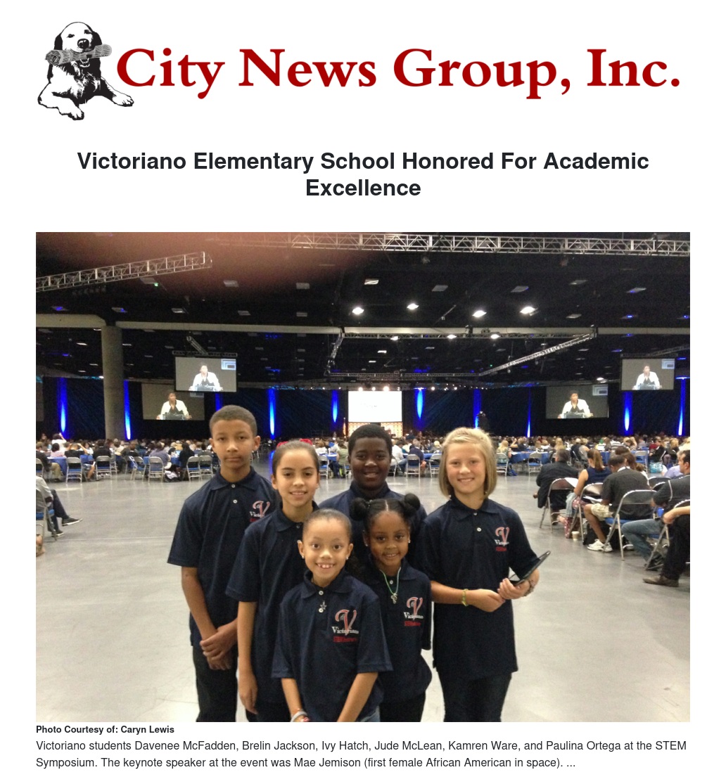 Students and teachers from Victoriano Elementary School recently returned from the Riverside County Education Summit where the school was honored as a “2014 Model of Academic Excellence and Innovation.” The Education Summit featured a workshop led by students in grades 2-5 titled, “Hands-On STEM – Building 21st Century Literacy in the Elementary Grades.” Victoriano has been recognized for providing educational programs that engage students in hands-on learning while accelerating literacy and multi-media skills.