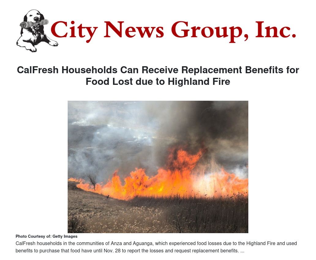 CalFresh households in the communities of Anza and Aguanga, which experienced food losses due to the Highland Fire and used benefits to purchase that food have until Nov. 28 to report the losses and request replacement benefits. The state recently approved extending the normal reporting period for food loss from 10 to 30 days. The additional time allows impacted CalFresh households in Riverside County to assess their losses and recover as much as possible.