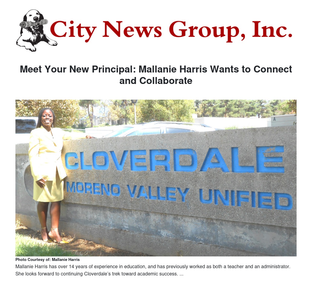Moreno Valley Unified School District Assistant Superintendent, Educational Services, Martinrex Kedziora said, “Mallanie Harris is an example of ‘excellence on purpose.’ Her knowledge of curriculum and instruction, coupled with the ability to build strong personal relationships with all stakeholders, is a winning combination. Harris stated that she wanted to work in the community where she lived. The staff of Cloverdale personally told me that they wanted a principal who would lead them in strategies, high expectations, positive feedback and authentic accountability. They both received their requests.”