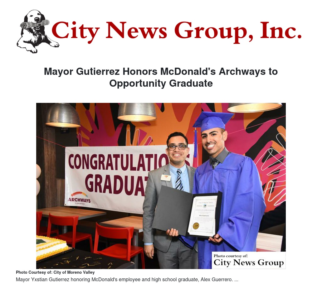 MORENO VALLEY>> On Thursday, April 27, Moreno Valley City Mayor Yxstian Gutierrez recently honored McDonald’s employee and Moreno Valley resident Alex Guerrero for earning his high school diploma through McDonald’s Archways to Opportunity program.