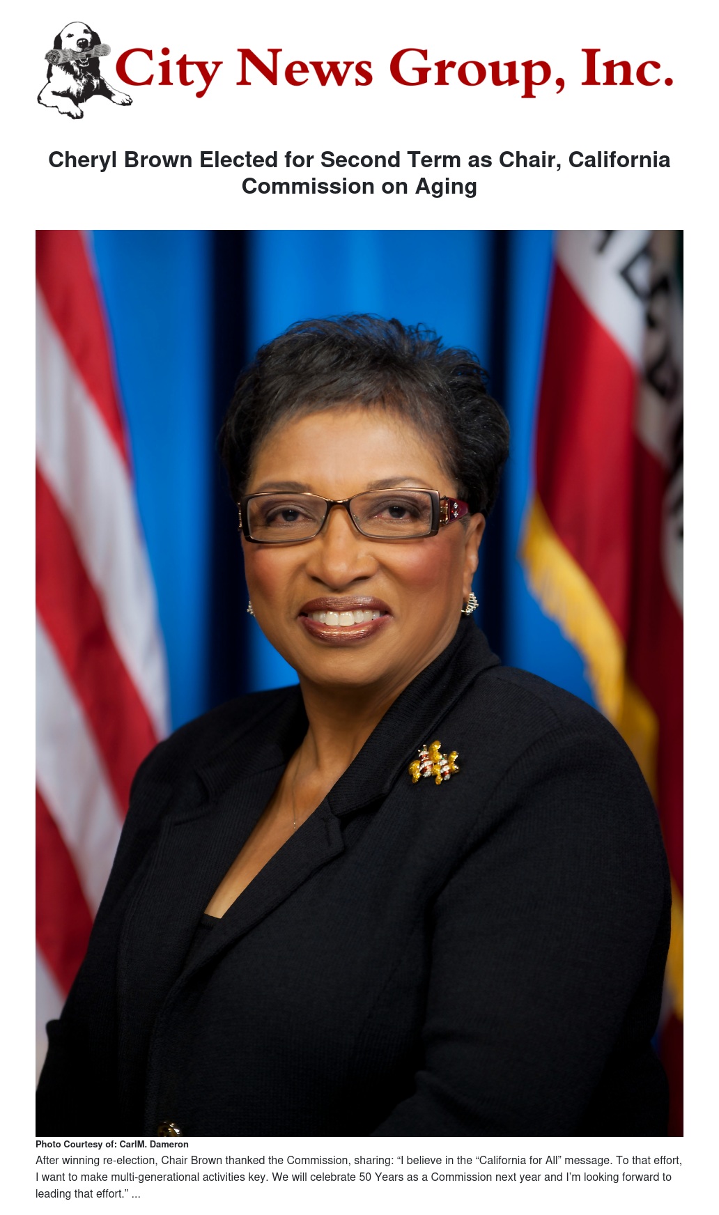 The California Commission on Aging (CCoA) re-elected Cheryl Brown to the position of Commission Chair at the General Meeting in Sacramento. In her first term, Chair Brown led the advancement of CCoA policy priorities and legislation and raised the visibility of the Commission.