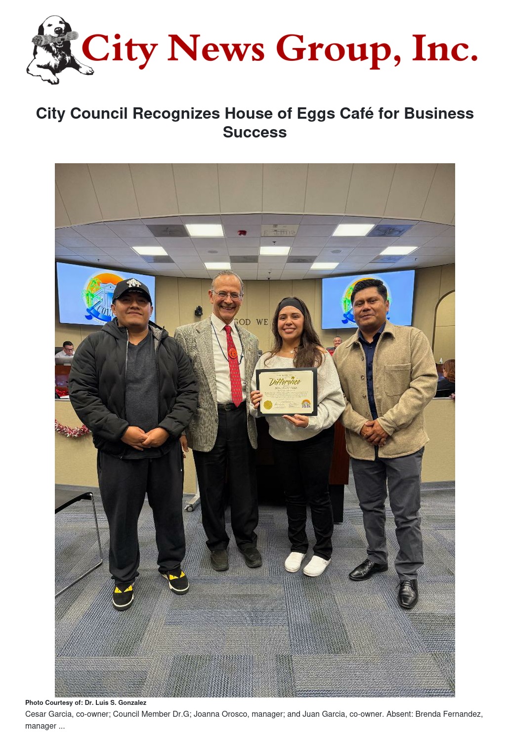 At the recent Council Meeting Dec 16, Council Member Dr.G (Dr. Luis S. González) presented Juan Garcia, Cesar Garcia and Joanna Orosco, co-owners and manager respectively, of House of Eggs Café with a Business Focus Recognition Award for their successful business in the City of Colton. Located at 182 East Valley Blvd, this family business is in the downtown area at the SW corner of Ninth Street and Valley.