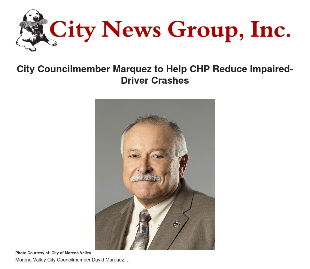 Moreno Valley City Councilmember David Marquez (District 3) will serve on a community-based task force convened by the Riverside Area California Highway Patrol (CHP) to reduce the number of impaired drivers and the crashes they cause. In a one-year period from October 1, 2017, to September 30, 2018, 370 people were injured or killed in traffic crashes involving impaired drivers on roadways within the CHP Riverside Area.