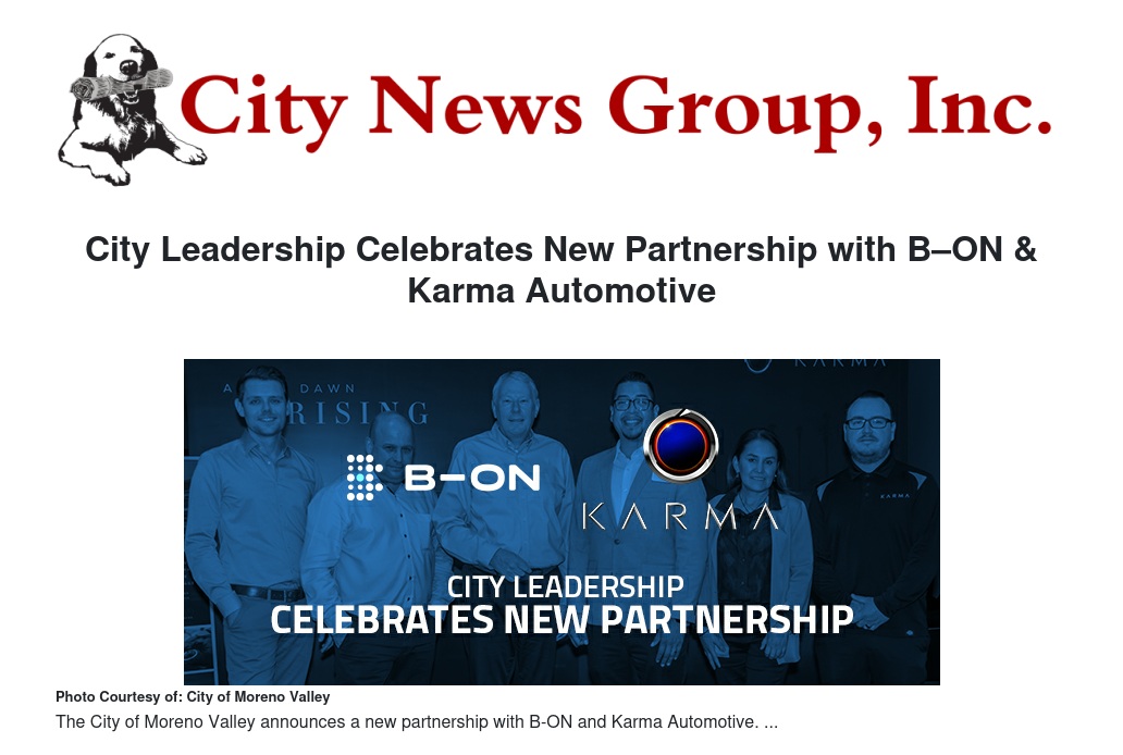 "The City and I are delighted to celebrate the partnership between Karma and B–ON," said Mayor Ulises Cabrera. "The partnership has the potential to create additional Moreno Valley jobs and will keep us leaning toward the future. Technology is evolving rapidly through artificial intelligence, automation, and information sharing, so I am proud Moreno Valley is at the forefront of attracting modern companies."