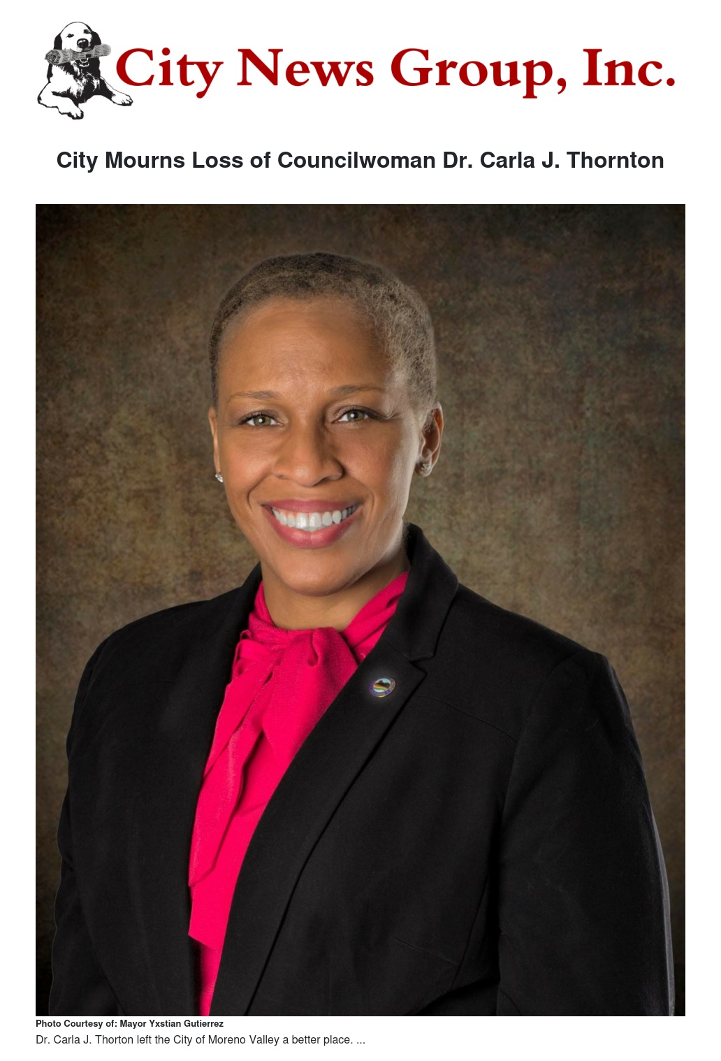 The City of Moreno Valley is mourning the loss of District 2 City Councilwoman Dr. Carla J. Thornton, who passed away January 21 following an illness.