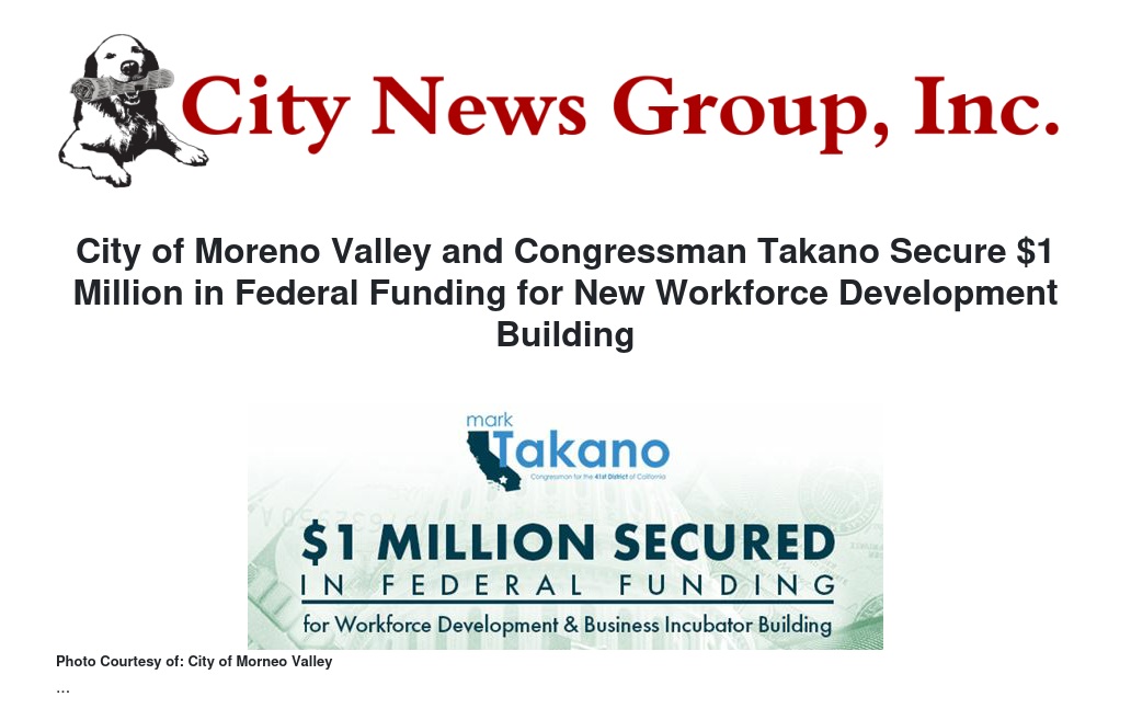 The City of Moreno Valley is proud to announce $1 million in federal funding for a new Workforce Development and Business Incubator building. Congressman Mark Takano secured these funds as part of the community funding projects included in the Fiscal Year 2024 appropriations process.