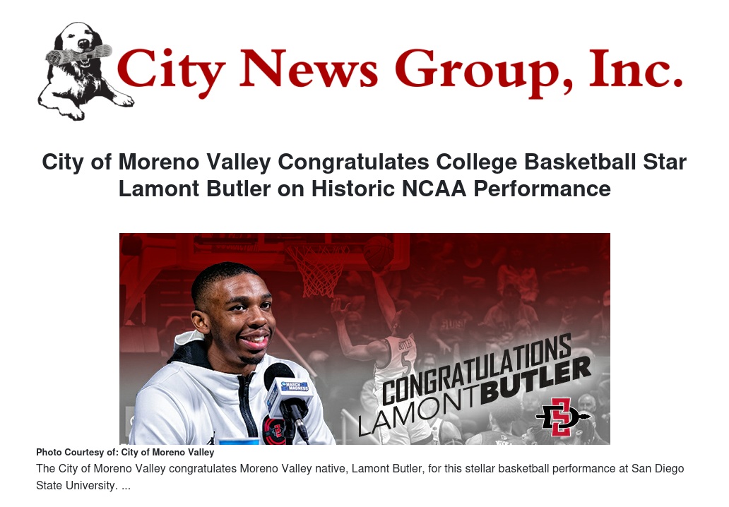 He is not the first Moreno Valley native to rise to stardom at SDSU—Clippers superstar Kawhi Leonard was also an Aztec. The City of Moreno Valley looks forward to what will come next in the promising basketball career of Lamont Butler.