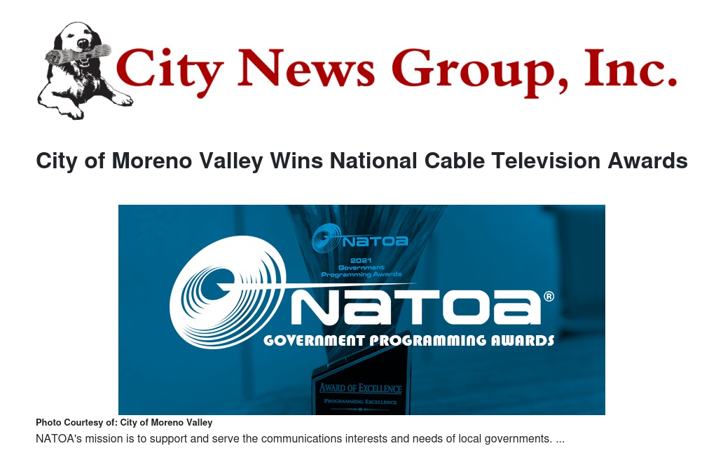 The City of Moreno Valley's Media and Communications Division has garnered national attention, winning multiple cable television awards. This year the National Association of Telecommunications Officers and Advisors (NATOA) awarded the City four coveted Government Programming Awards. Moreno Valley competed against Cities across the country, from California to New York.