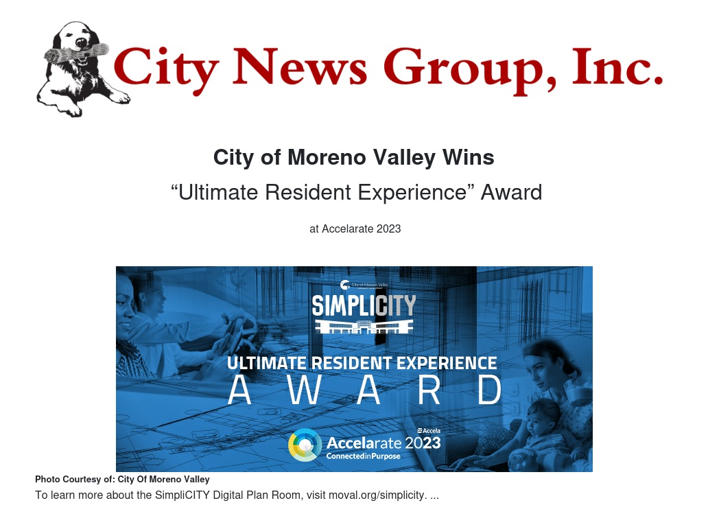 The City of Moreno Valley’s innovative SimpliCITY Digital Plan Room has been honored with the “Ultimate Resident Experience” award at the Accelarate 2023 Conference in Washington, D.C.