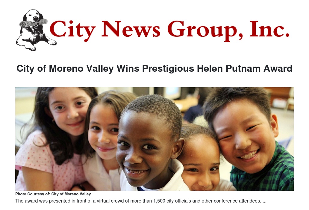 At today’s League of California Cities Annual Conference & Expo, the city of Moreno Valley received the esteemed 2020 Helen Putnam Award for Excellence in the Cities Counties Schools (CCS) Partnership Intergovernmental Collaboration award for the city’s innovative “After School Education and Safety — Expanded Learning Program.” The award was presented in front of a virtual crowd of more than 1,500 city officials and other conference attendees.