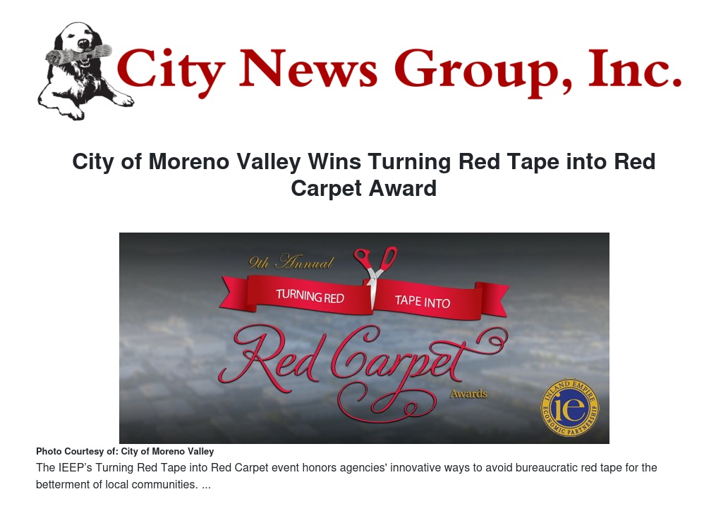 The IEEP is a regional economic development organization dedicated to improving the economic vitality of the Inland Empire for more than 30 years. The organization is focused on bringing jobs to the region, fostering economic opportunities, and enhancing the quality of life for residents of Riverside and San Bernardino counties. The IEEP’s Turning Red Tape into Red Carpet event honors agencies that have developed innovative ways to avoid bureaucratic red tape for the betterment of local economies and communities.