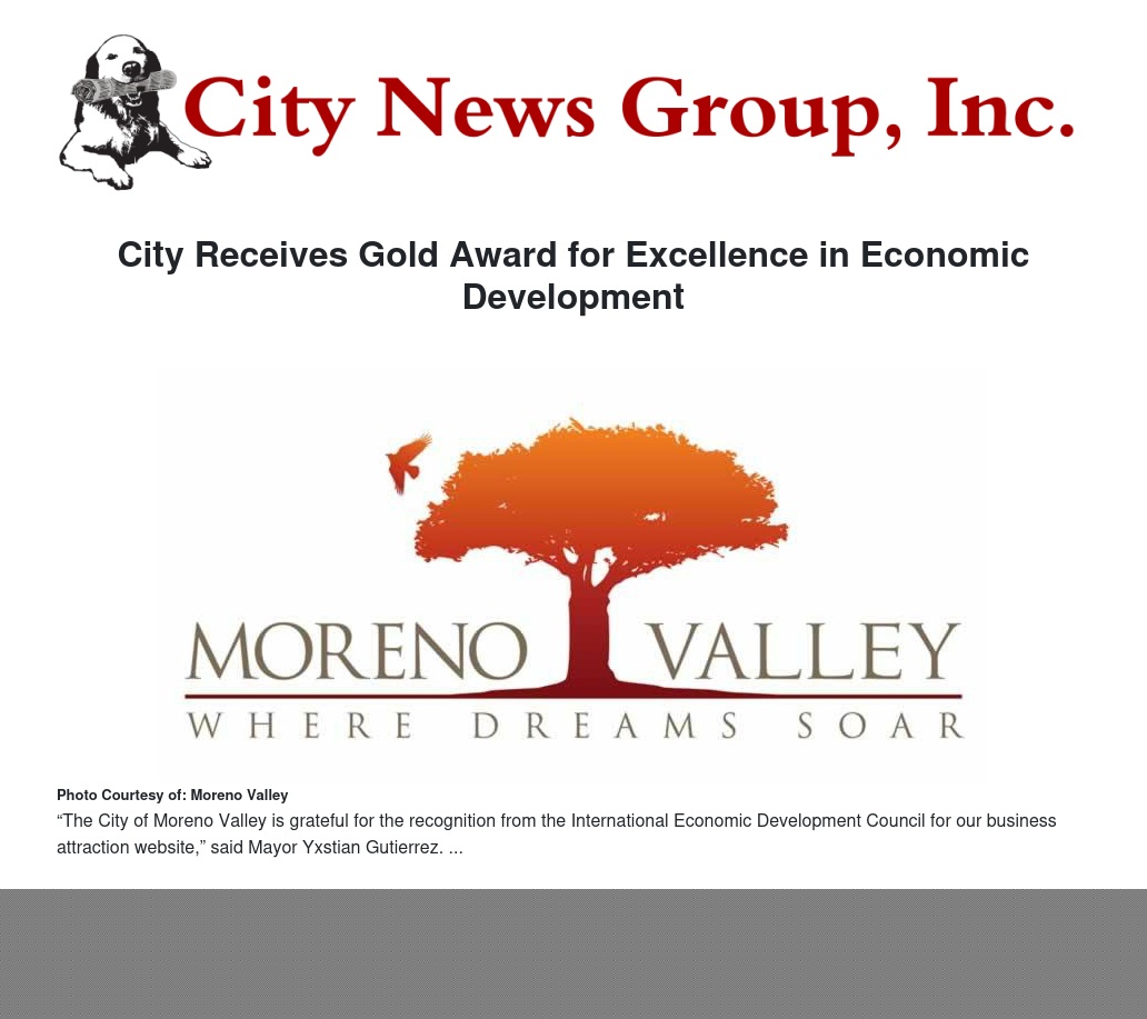 The City of Moreno Valley was honored to receive a Gold Excellence in Economic Development Award from the International Economic Development Council for its Moreno Valley business attraction website (morenovalleybusiness.com).