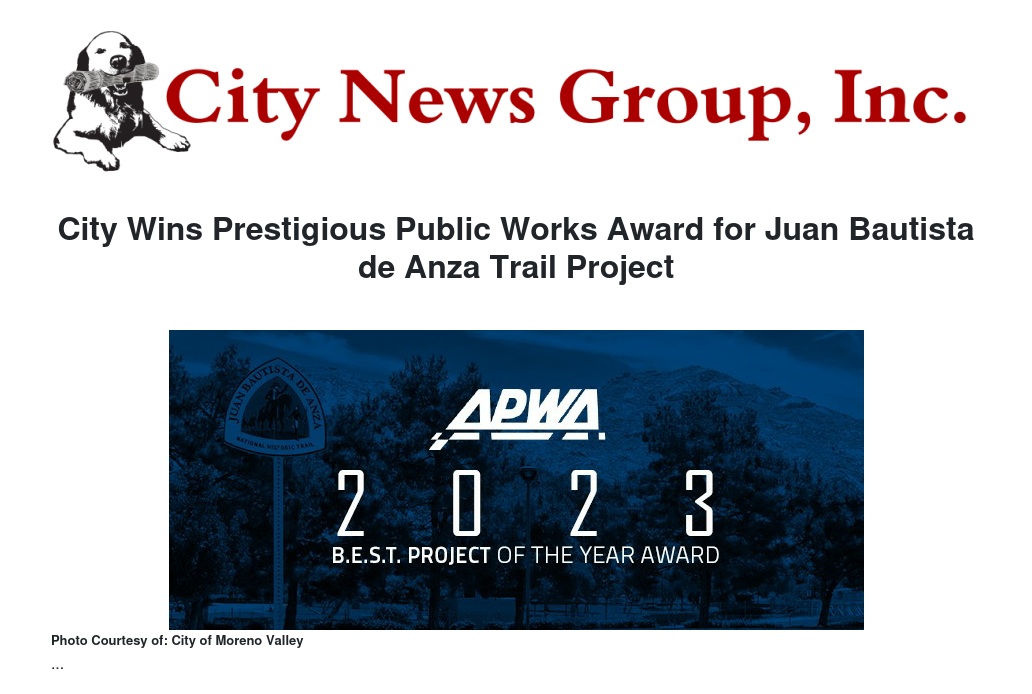 City Wins Prestigious Public Works Award for Juan Bautista de Anza Trail Project by City of Moreno Valley - City News Group, Inc.