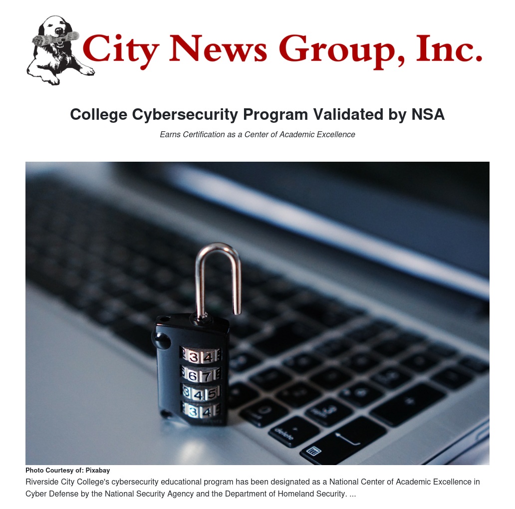 Riverside City College has been designated as a National Center of Academic Excellence in Cyber Defense by the National Security Agency and the Department of Homeland Security.
