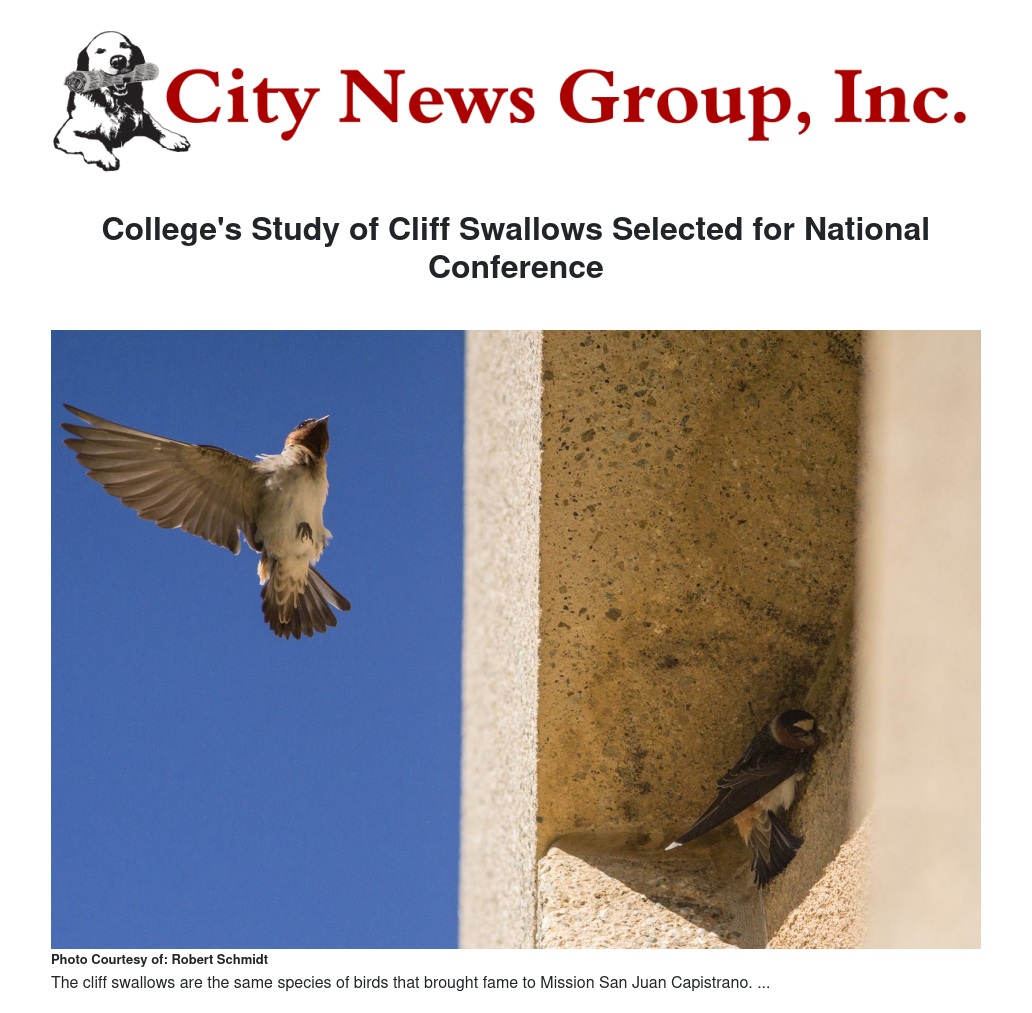 Moreno Valley College’s study of cliff swallows has been selected for the National Conferences on Undergraduate Research (NCUR) at the University of Central Oklahoma in April. The NCUR, established in 1987, is dedicated to promoting undergraduate research, scholarship, and creative activity in several fields of study.