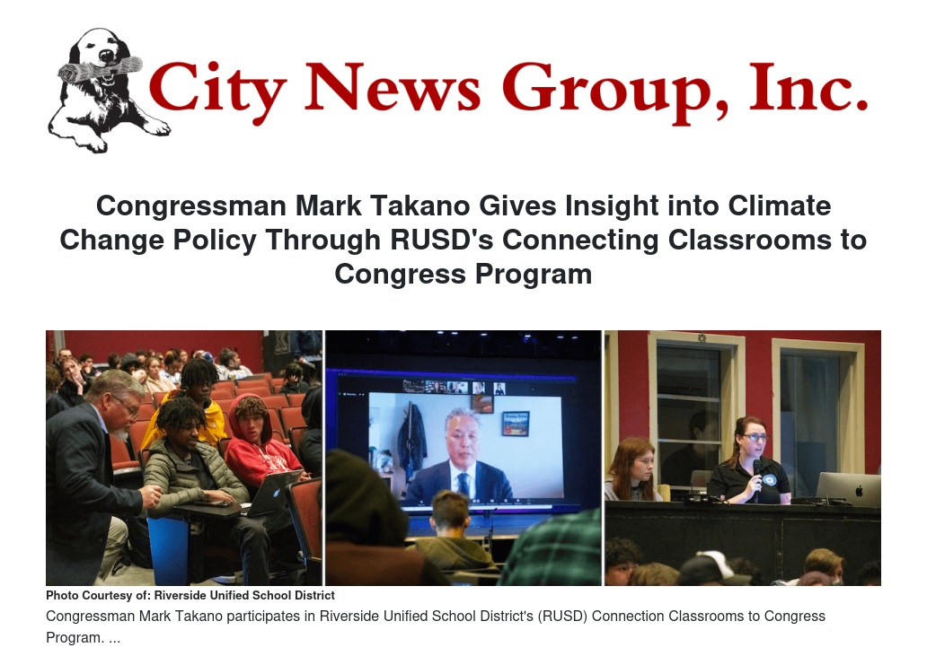 "Thank you to Congressman Takano for participating in Connecting Classrooms to Congress," said Carolyn Power, Instructional Services Specialist. "His willingness to answer student questions is an impactful way to end research work and inspire continued civic engagement beyond high school."